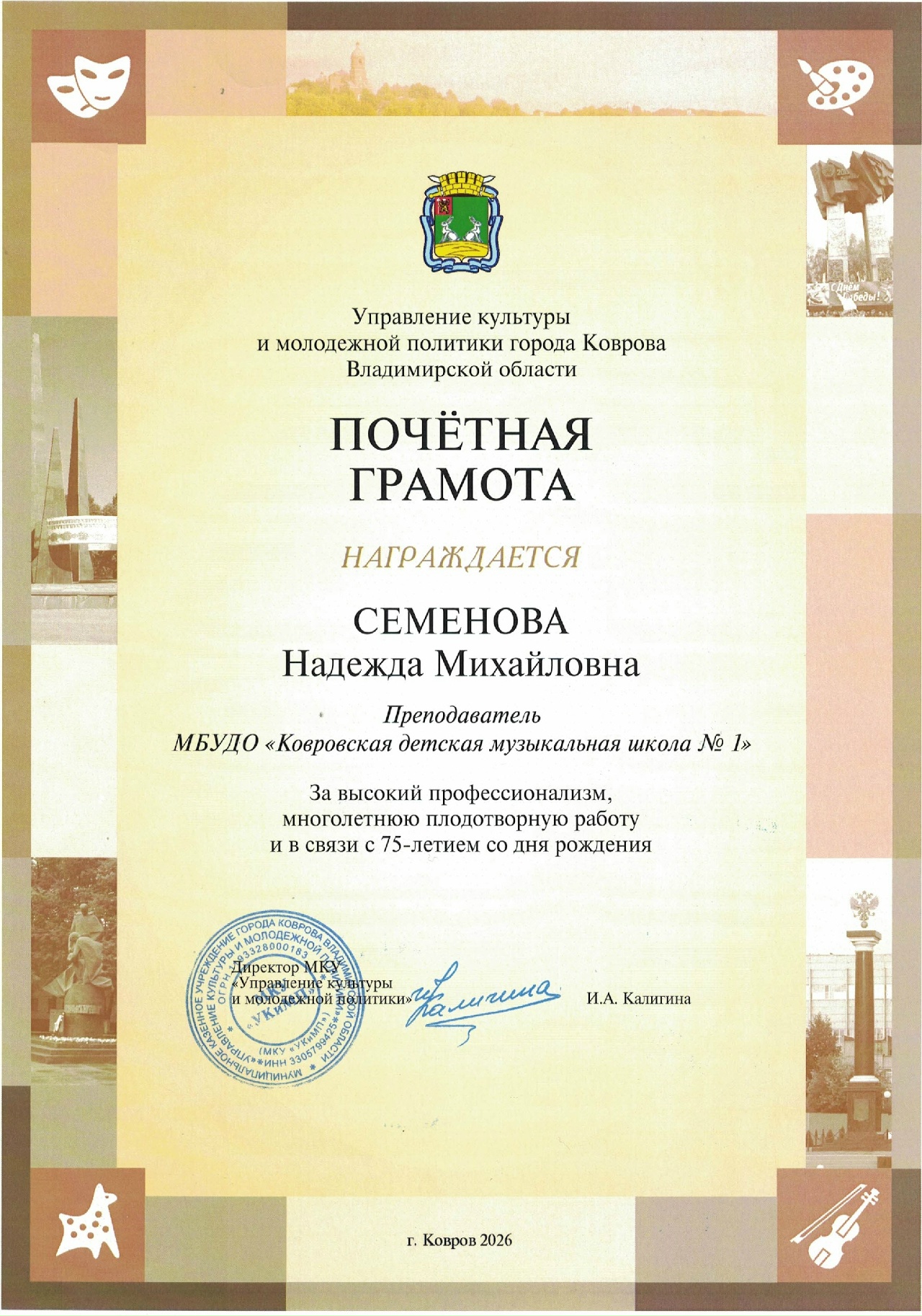 Почти 55 лет Надежда Михайловна дает ученикам крепкие знания теоретических музыкальных предметов, воспитывая у ребят трудолюбие и целеустремлённость. Выпускники Семеновой Н.М. работают преподавателями в консерваториях, музыкальных колледжах, музыкальных школах, общеобразовательных школах и музыкальными руководителями в детских садах нашей страны и зарубежья.