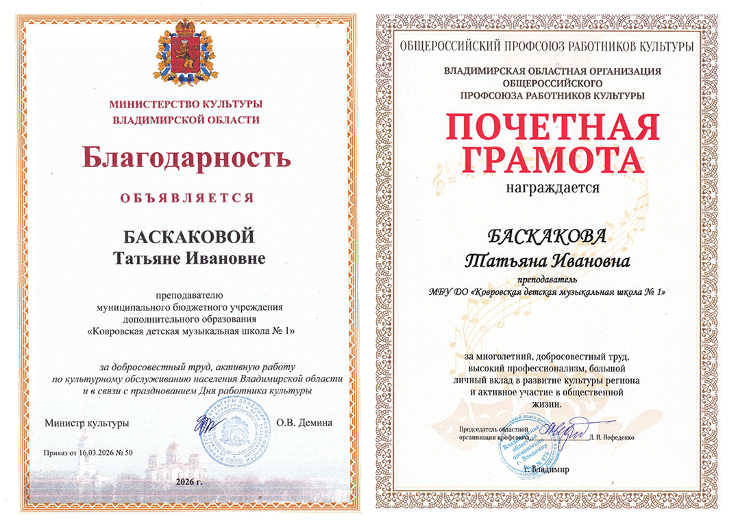 ПОЗДРАВЛЯЕМ преподавателя Ковровской детской музыкальной школы №1 БАСКАКОВУ ТАТЬЯНУ ИВАНОВНУ, которая была награждена БЛАГОДАРНОСТЬЮ Министерства культуры Владимирской области и ПОЧЁТНОЙ ГРАМОТОЙ Владимирской Областной организации Общероссийского профсоюза работников культуры.