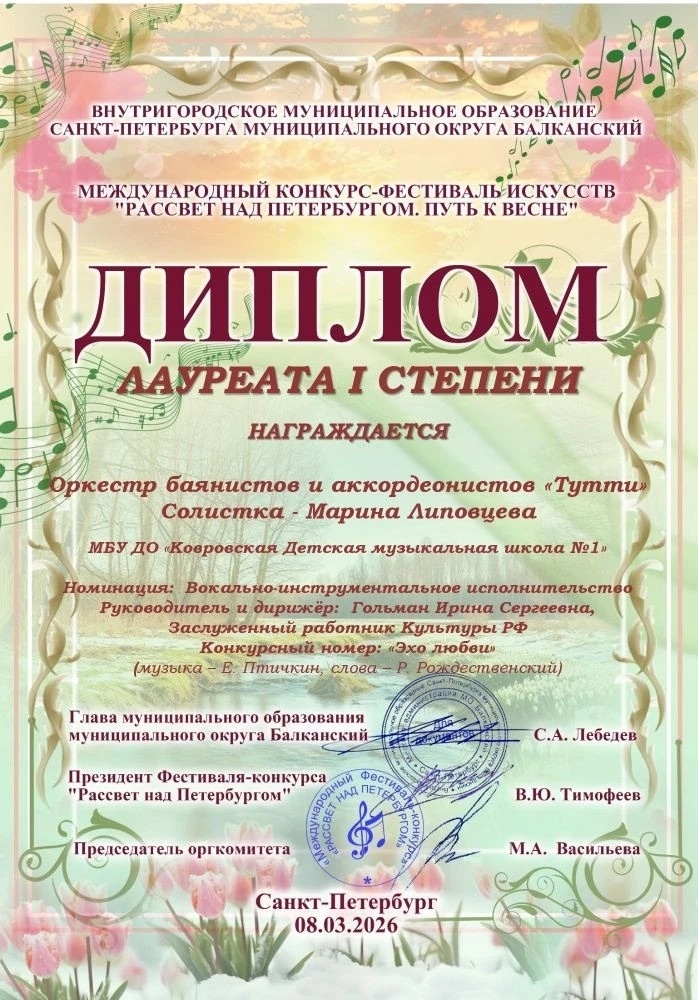 По результатам конкурса в номинации Вокально-инструментальное исполнительство с конкурсным номером "Эхо любви" (муз. Е. Птичкина, сл. Р. Рождественского) был присужден Диплом Лауреата I степени!