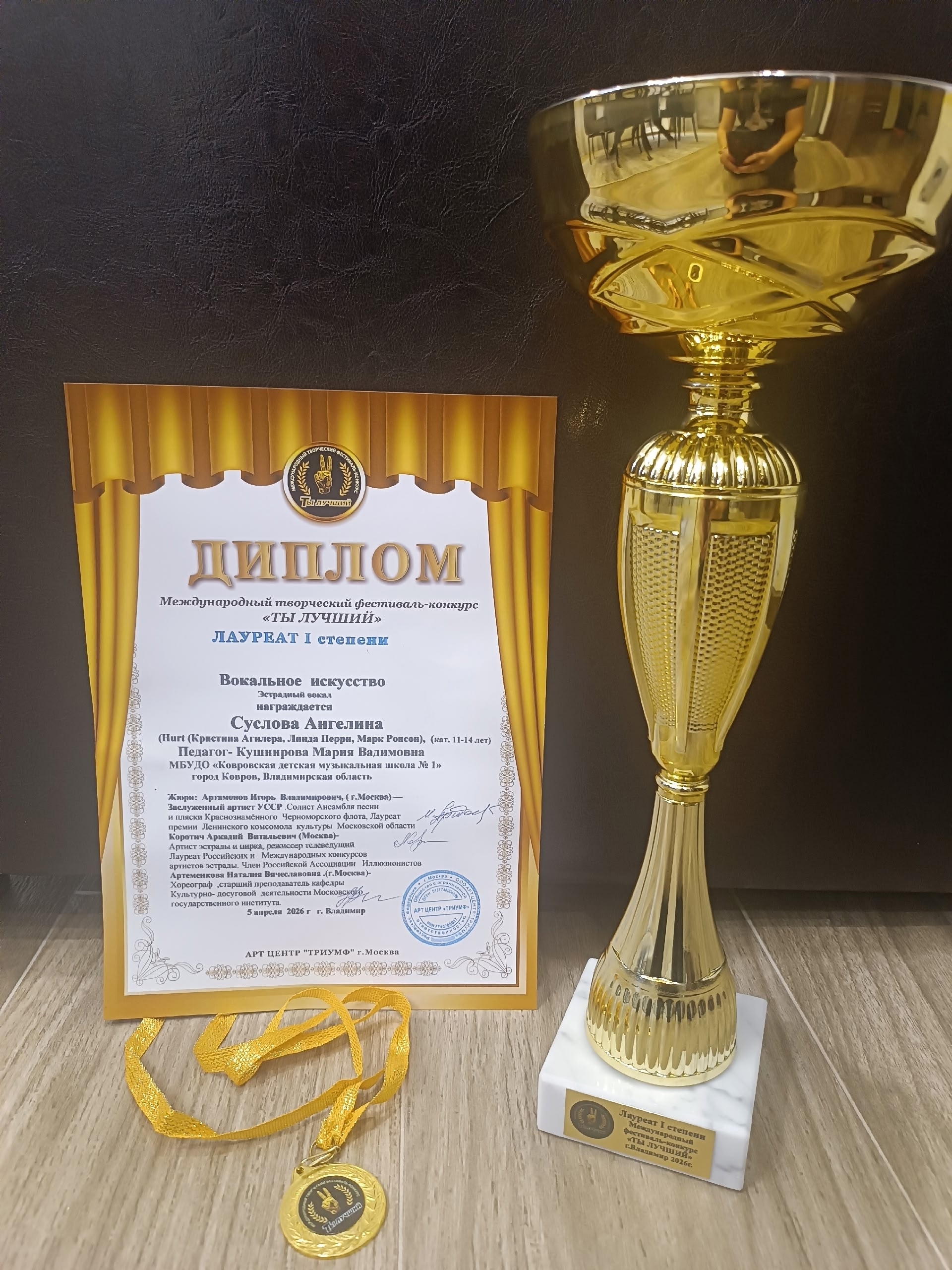 Ангелина Суслова (преп. Кушнирова Мария Вадимовна) была награждена дипломом Лауреата I степени на Международном творческом фестивале-конкурсе "Ты лучший", который проходил 5 апреля во Владимирском государственном университете им. А.Г. и Н.Г Столетовых.
